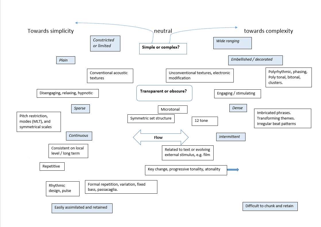 Psychology has its own view of simplicity and concerns itself particularly with memory. Take the following patterns, 9, 11, 13, 15, 17, 19, and 5, 12, 19, 48, 20, 15. Which is simple? We would immediately select the first, but it is more complex than it seems. If the second pattern is seen as birth and death dates of a loved one (5th December, 1948 to 2015) the second is simpler, and over a period of time is more likely to be remembered (remembering which number started the sequence when it has no particular meaning makes it difficult to recall). Perhaps we should add to the notion of anticipation the ease of recall after the event, this doesn’t make the music any more simple but affects our perception of the music as being simple.